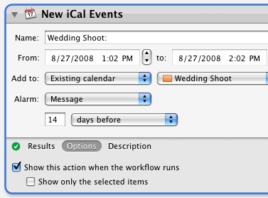 Finally, click on Options and check the "Show this action when workflow runs." This is very important to this workflow because it provides you the opportunity to add the specific date, time, and additional name information to the event. If you don't select this box, the existing dates (most likely the current date) in the workflow action will be used.