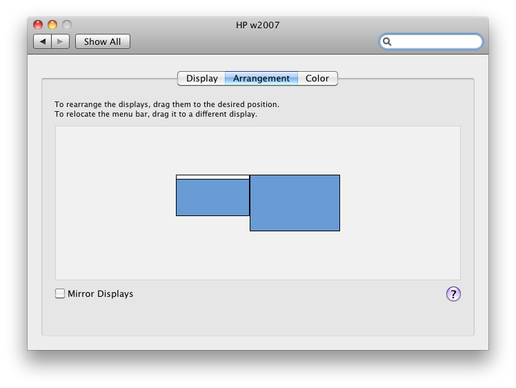 With a second monitor, you can actually drag the menu bar from the main display to the second display. But this means all application menus, including the Dock will also get dragged over to the second monitor. Basically, you kind of make your second monitor the default screen. Actually, though, if one of your screens is larger than the other, it might not be a bad idea to have the menu and dock on the smaller second monitor, so you can have more room on your larger main monitor. I’ve used this setup a few times. However—not to confuse the issue—when you drag the menu bar over to the second screen, all applications open up on that screen, and you have to drag them over to the main screen. If you quit the application, it doesn’t open back up on the main screen where you last used it; it re-opens on the second monitor.
